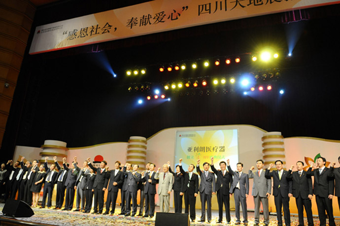 2008年 5月31日烟台亚利朗医疗器械有限公司在北京会议中心举行的“感恩社会、奉献爱心”四川汶川大地震捐款仪式上,在金仁相总经理及所有任职员爱心行动的影响下,所有的亚利朗人都积极踊跃慷慨解囊当场募集现金90万元,通过中国老龄事业发展基金会向四川地震灾区的老年人伸出援助之手,募集的善款用于地震灾区孤寡、孤残老人的救助。
